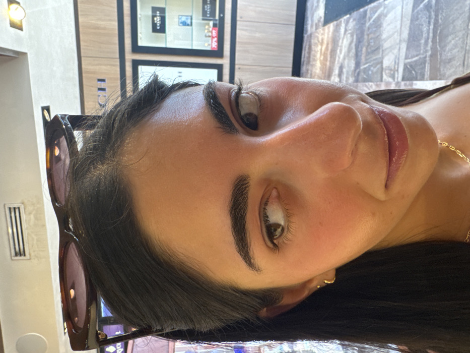 The image presents a close-up, head-and-shoulders view of an individual, likely female, with dark hair and a light complexion. Dark brown tortoiseshell sunglasses rest on top of the subject's head. The subject's face is oriented slightly towards the right, with both brown eyes directed towards the viewer's left. The mouth is slightly agape, revealing glossy lips. A small gold hoop earring is visible on the left earlobe, and a thin gold chain necklace is worn around the neck. The background reveals an indoor commercial environment. A rectangular ventilation grate is visible on the upper left wall or ceiling. To the right, the word 'COACH' is displayed on a light-colored wall panel, indicating a retail store. Below this, two framed display cases contain commercial products, one of which includes a partial '70% OFF' price reduction sign. The floor in the lower right consists of light-colored, patterned tiles. This scene is consistent with a retail interior, such as those found in the commercial districts of San Miguel de Cozumel, Mexico.