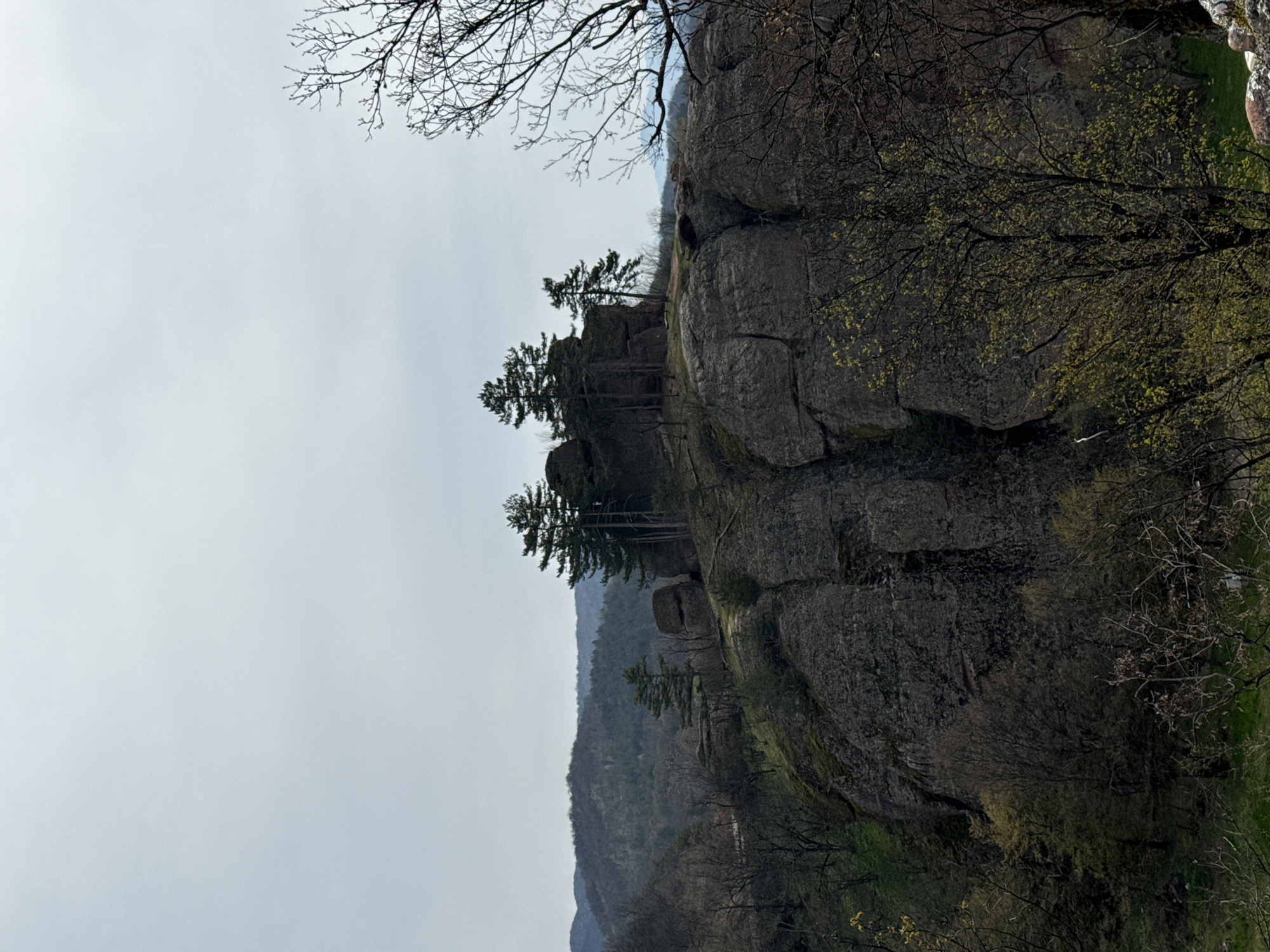 The image captures a landscape featuring the Belogradchik Rocks in Belogradchik, Bulgaria. A rocky cliff face dominates the foreground, with trees clinging to its surface. In the background, there are forested hills. The sky is overcast, and the image is oriented in a vertical format. There are some bare tree branches in the upper part of the image, adding to the overall composition.