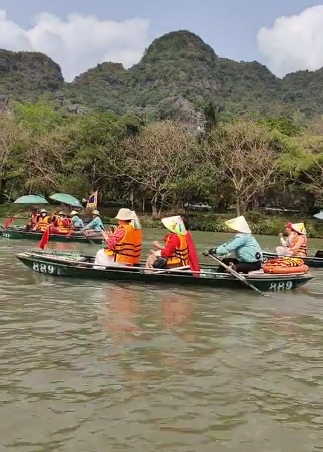 The video captures a scenic view of several long, narrow boats gliding across a body of water. Each boat is occupied by multiple people, all wearing traditional Vietnamese conical hats and orange life vests. One person on each boat can be seen paddling the boat forward with a single oar. In the background, lush, green hills rise into the sky, creating a picturesque backdrop. The sky is partly cloudy with visible blue patches. The water surface reflects a slight ripple, adding to the dynamic nature of the scene. The boats have numbers displayed on their sides, such as "889".