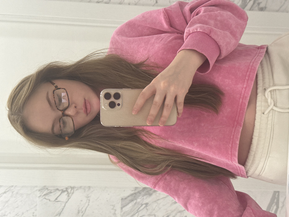 A young woman with long brown hair and glasses holds a smartphone, taking a selfie in a mirror. She is wearing a pink cropped sweatshirt and light-colored sweatpants with a drawstring. The background features a white wall and marble-patterned surface. The image is rotated, presenting a slightly angled view of the subject and her surroundings.