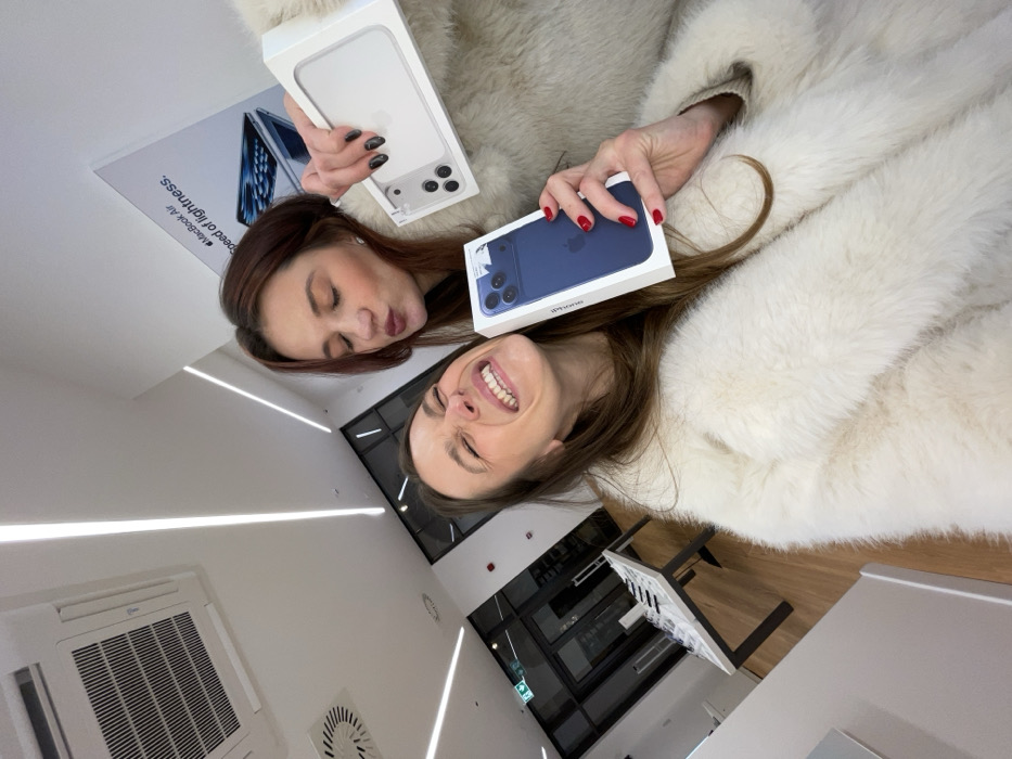 Two women in fluffy white coats pose with iPhone boxes. One holds a white iPhone box with dark nails, while the other smiles with a blue iPhone box and red nails. The photo is taken from an unusual angle, showing the ceiling with lighting fixtures, air conditioning units, and a blurred view of a store or office in the background. A poster advertising a MacBook Air is visible.