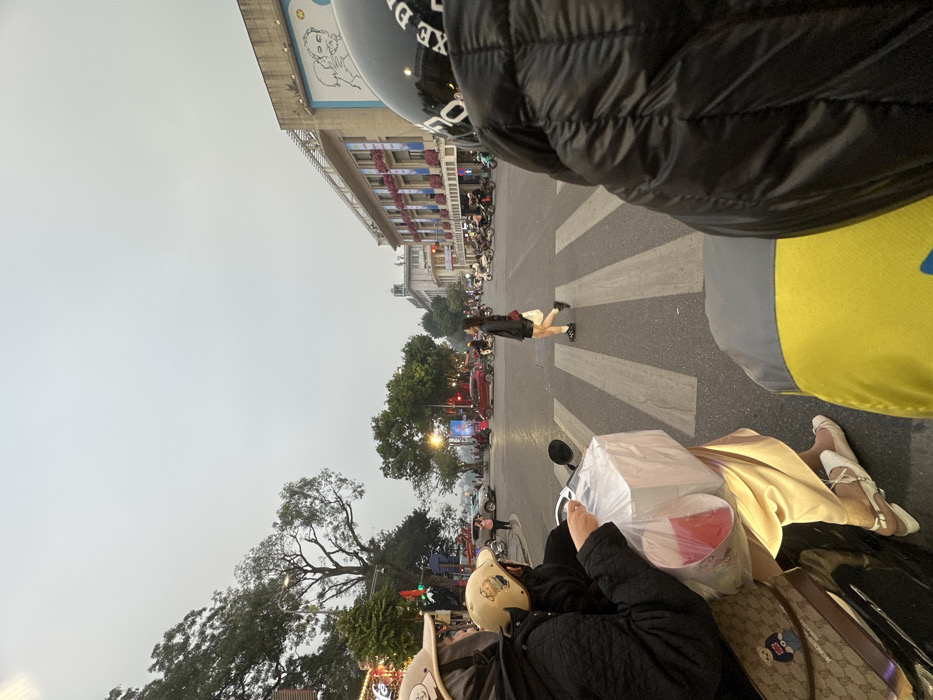The image depicts a street scene at an intersection on Tràng Tiền Street, Hà Nội, Vietnam, near Hoàn Kiếm Lake. The perspective is from a motorbike stopped at a pedestrian crossing under an overcast sky, possibly during twilight. In the foreground left, a person wearing a black jacket and a conical hat is operating a motorbike. Behind them, a passenger in a black jacket and a light brown helmet with a cartoon bear design is holding a large clear plastic bag containing white boxes and red items. This passenger wears a shiny light-gold skirt and light-colored flat shoes; a brown Gucci shoulder bag with a bear motif rests on their lap. In the foreground right, the back of a person in a black puffer jacket and a black helmet with white text is visible, indicating another stopped motorbike. In the midground, a female pedestrian with dark hair, wearing a black long-sleeved top, a short light-colored skirt, and dark shoes, walks from left to right across the white-striped pedestrian crossing. She carries a light-colored bag in her left hand. The intersection features multiple red traffic signals in the distance, indicating stopped traffic. Numerous motorbikes, scooters, and a few cars are queued at the intersection or moving slowly. On the right, a multi-story building with a light-colored facade, balconies adorned with red flowers, and a large mural featuring two stylized faces or figures on its upper section is prominent. This building is on Tràng Tiền Street, adjacent to Tràng Tiền Plaza. On the left and in the distance, various other buildings and large trees with dense foliage line the street. The sky is uniformly light grey and hazy.