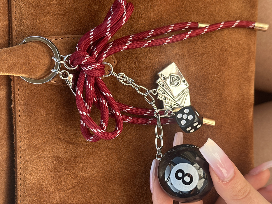 A close-up photograph depicts a human hand holding a black 8-ball charm, which is part of a keychain attached to a brown, textured material resembling suede. **Location:** The exact location within Inglewood, United States, cannot be determined from the image as no environmental or architectural features are visible. **Scene Details:** * **People:** One human hand is visible on the lower left side of the frame. The hand features long, manicured nails with an ombré design, transitioning from a light pink base to clear tips. This hand is actively holding the spherical black 8-ball charm. * **Subjects/Objects:** * **Keychain Assembly:** A silver-colored metal keyring is positioned at the top center, from which a thick, dark red braided rope with intermittent white stripes is looped and tied. This rope extends downwards to the right. * **Charms:** Attached to the rope via a smaller silver ring and a silver-colored chain are multiple charms: * A glossy black spherical 8-ball charm with a white circle containing the number "8." * A black cubic dice charm, displaying faces with five and three white dots, connected by a gold-colored cylindrical tip at its base. * A fanned arrangement of five silver-colored playing card charms, depicted as the 10, Jack, Queen, King, and Ace of Spades, from bottom to top. * **Background Material:** The dominant background is a rich, medium-brown material with a soft, textured appearance, indicative of suede or a similar fabric. Faint stitching lines are visible horizontally across the top portion of this material, suggesting it is part of an item such as a bag or garment. * **Actions/Interactions:** The hand is holding the 8-ball charm. The keychain, comprising the rope and various charms, is attached to the brown background material, implying it is secured to an item. * **Environment:** The lighting is uniform, suggesting an indoor setting or shaded outdoor area. No further environmental details are discernible.