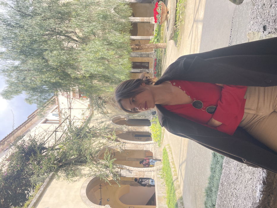 The image depicts a bright daytime scene within the Chiostro di San Francesco (Cloister of St. Francis) in Sorrento, Italy. In the foreground, a young adult female is positioned on the left, seated or leaning on a low, weathered stone wall. She has medium-brown hair styled in a low bun with some loose strands, and her gaze is directed upwards and to the right, beyond the frame. She wears a long-sleeved red Henley shirt with white buttons, light beige corduroy pants, and a dark brown or black overcoat draped over her shoulders. A pair of round-lensed sunglasses is clipped to her shirt collar. Her arms are crossed. The background reveals the cloister courtyard. The perimeter is defined by light-colored, possibly stuccoed, buildings featuring a series of arched walkways supported by stone columns. Green climbing vegetation, including some with purple flowers, adorns the upper sections of the walls and pergolas. In the center-right of the courtyard stands a large tree with abundant, long, slender light green leaves. Further back on the right, a terracotta-colored pot containing red flowering plants rests on a stone base. The courtyard ground is paved, and sections of green grass and low-lying plants are visible. Two indistinct individuals are present in the left mid-ground, walking or standing near the arched perimeter; one wears a dark backpack, and the other has a red garment. The sky above is partially visible, appearing light blue with some cloud cover, indicating natural daylight.