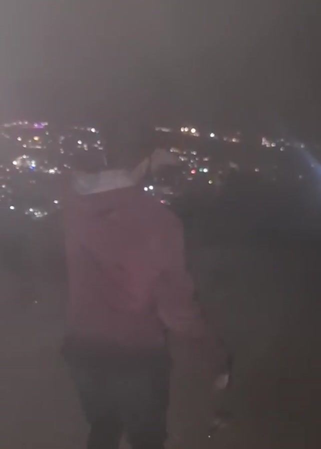 A blurry video shows a man in a maroon jacket and dark pants dancing in front of a city at night