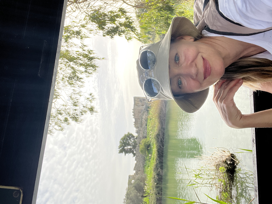 The image depicts an outdoor scene in Rosh Haayin, Israel, featuring a woman in the foreground with the Yarkon River and Antipatris Fortress in the background. A middle-aged woman, with light skin and light brown hair, occupies the lower right portion of the frame. She is smiling faintly and looking directly at the camera. She wears a light khaki-colored bucket hat with clear-framed sunglasses perched on top. Her left hand is resting on a dark horizontal surface, possibly a railing. A white garment is visible under a light-colored backpack strap on her right shoulder. Behind the woman, the Yarkon River flows horizontally across the middle ground. Its water is a greenish-blue, reflecting light. Reeds and other vegetation line the riverbanks and form small clusters within the water. On the far bank, partially obscured by greenery, are the stone ruins of a large structure, identified as the Antipatris Fortress. The fortress walls are weathered and appear to be constructed from light-colored stone, with some openings visible. Trees and green grass surround the ruins. The sky above is partially cloudy with scattered white clouds against a lighter blue, suggesting an overcast or partly cloudy day. A bright spot, indicative of the sun, is visible in the upper right quadrant. A tree with light green foliage hangs into the frame from the top right. A dark, solid horizontal beam or structure runs across the top of the image, and a similar dark horizontal surface is present at the bottom, suggesting the vantage point is from within a covered viewing area or structure.