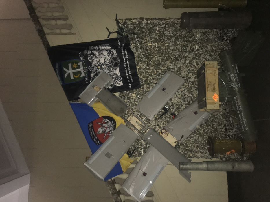 disassembled drone on a wall in a building in L'viv, Ukraine, at the coordinates provided. The drone is gray and white, with its four wings spread out in an "X" shape. The drone is partially obscured by other objects on the wall, including a black flag with a yellow symbol, a blue and yellow flag with a red emblem, a wooden box with writing on it, a long gray object, and a smaller gray object. There are also several small, gray objects on the wall.