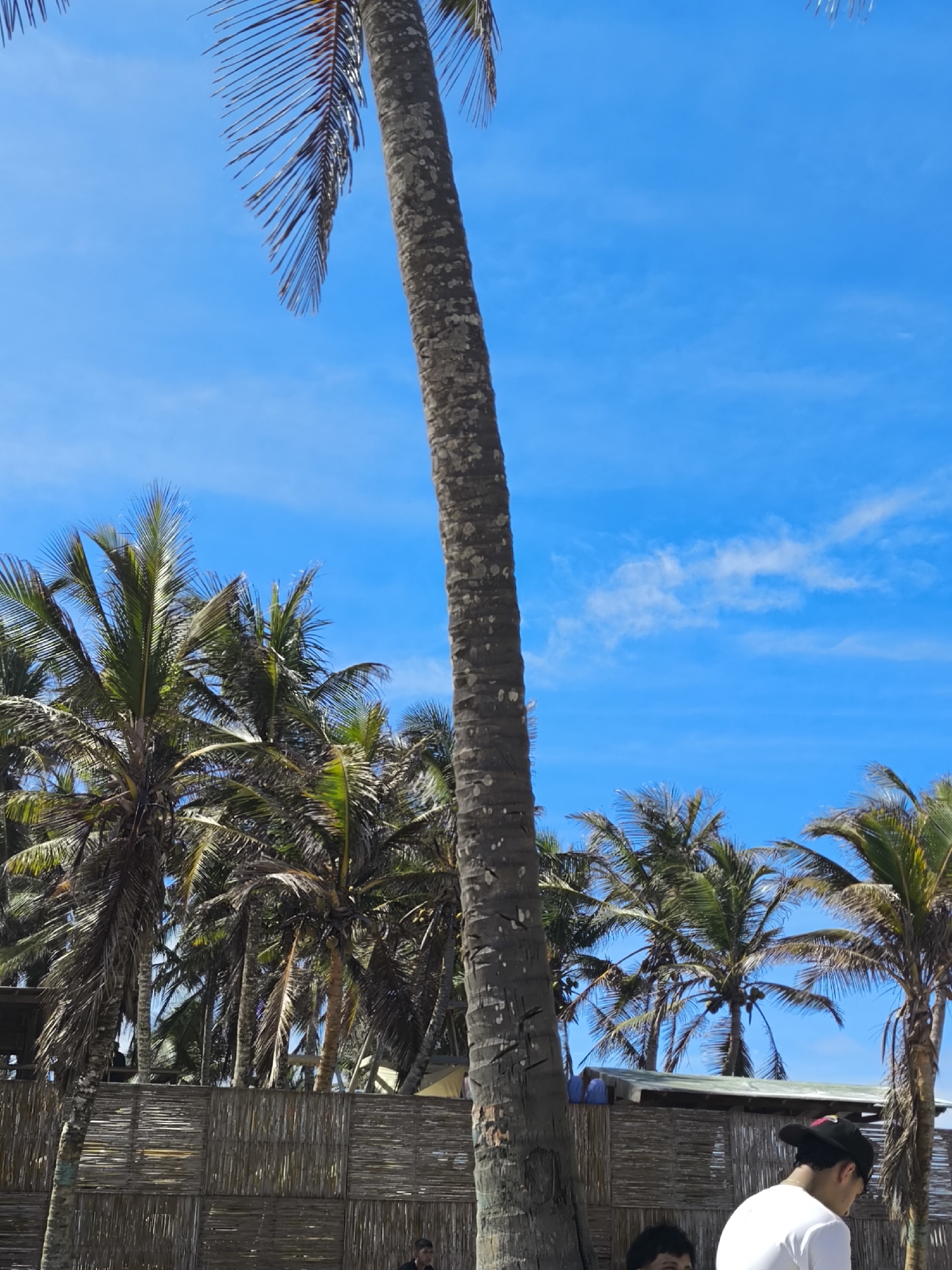 beach scene at Playa Parguito, Venezuela. Several palm trees with green fronds and brown trunks fill the frame, set against a bright blue sky with scattered white clouds. A tall, light-colored, woven fence spans the lower portion of the image, partially obscuring the base of the palm trees. In front of the fence, partially visible at the bottom of the image, are the tops of two people's heads and shoulders. The person on the right wears a white t-shirt and a black baseball cap, while the person on the left has short black hair.