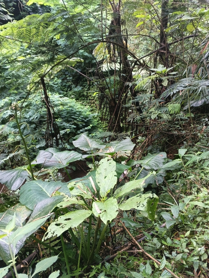 The scene captures a dense, natural green environment within the city of Butwal, Nepal. The foreground features several large-leaved plants, including a prominent central specimen with broad, spade-shaped leaves displaying multiple perforations and irregular edges, indicative of insect damage. Smaller green foliage and brown woody detritus are visible on the ground level. The midground is occupied by a dense arrangement of woody plants and vines with dark trunks, intermixed with feathery green leaves. A faint, lighter-toned linear depression, possibly a narrow path or dry stream bed, is discernible. The background consists of a continuous, thick canopy of varied trees and undergrowth, suggesting a heavily forested area. No human subjects or man-made objects are present. The illumination is diffused, consistent with an overcast sky or deep canopy shade.