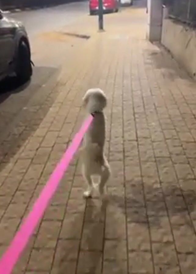 A white, small dog on a pink leash is being walked at night on a sidewalk