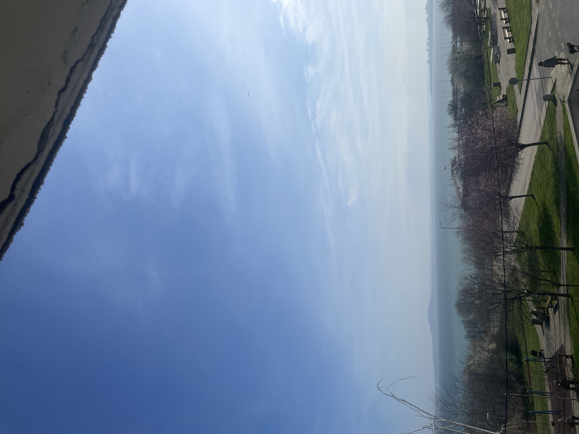 The image presents an elevated, panoramic view of Burgas, Bulgaria, overlooking a public park and the Burgas Bay (Black Sea). The upper portion of the frame is bisected by the rough, textured underside of a concrete balcony or overhang. The sky is clear blue with sparse, wispy white clouds. A faint aircraft contrail is visible in the mid-right sky, along with a small, dark bird in flight further to the right. Sunlight illuminates the scene from the right. In the mid-ground, a public park features manicured green grass, paved asphalt pathways, and numerous deciduous trees. Some trees are bare, while others exhibit sparse pink blossoms, indicative of early spring. A prominent bare tree branch extends from the lower-left foreground into the upper-left frame. A playground structure with blue swings and a slide is visible on the left. Several wooden benches and concrete picnic tables are arranged throughout the park. A single streetlight stands near the center-right. One individual, dressed in a grey jacket and reddish-brown trousers, walks from right to left on a paved path, accompanied by a dark-furred dog on a leash. Two other individuals are partially visible, seated on a bench further within the park, obscured by trees. Beyond the park, the large expanse of calm, blue-green water of Burgas Bay is visible. On the distant left horizon, a hazy mountain range stretches across the bay. To the right, an area consistent with a marina or port is identifiable by several boat masts, and a red flag flies from a pole near the water's edge. Further along the distant horizon to the right, a low-rise cityscape is silhouetted against the sky.