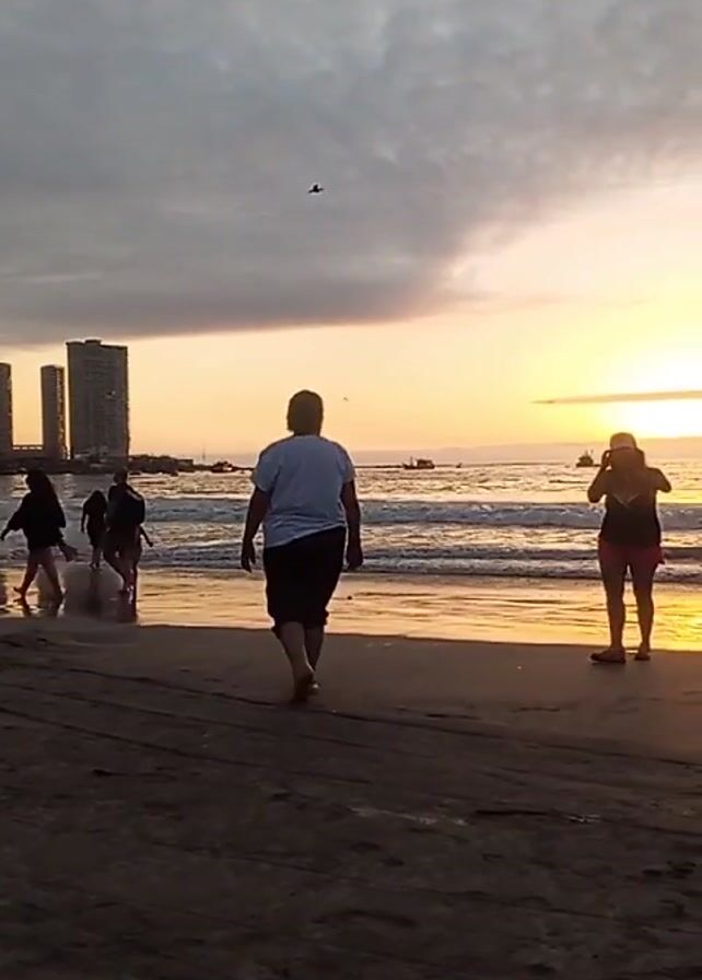beach scene at sunset with four people visible. Two women stand closer to the camera. One is walking towards the water while the other raises a smartphone to take a picture of the sunset. Two other people are seen walking further away, closer to the water’s edge. In the background, several tall buildings can be seen to the left, and the sun is setting over the ocean with several boats on the water. The sky is cloudy, and the beach is dark sand.