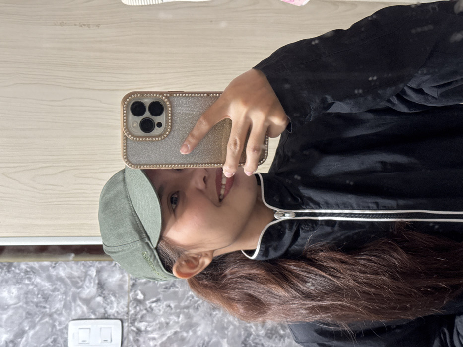 A young adult female is depicted in a mirror selfie, located in Davao City, Philippines. The subject presents the left side of her face, smiling, and wears a light olive green baseball cap with faint embroidery on the side. Her dark brown hair is styled in a low ponytail. She is wearing a black long-sleeved jacket with a white zippered front and white trim along the collar and zipper. Her right hand, from the viewer's perspective, holds an iPhone Pro model smartphone. The phone is encased in a glittery, gold-toned gradient case adorned with small, round embellishments along the edges and around the camera module, partially obscuring the subject's face. The background, a reflection in the mirror, shows a grey marble-patterned wall with a white double light switch on the left, and a lighter, possibly wooden, paneled wall on the right. A small, white, unidentified object is partially visible on the far right edge of the frame.