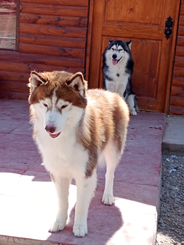 - "Two Siberian Huskies stand in front of a rustic wooden building" by FM-skUe82, licensed under CC BY 4.0