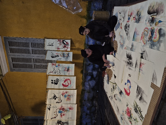 The image depicts an outdoor, nighttime scene in Hội An Ward, Vietnam. Two East Asian individuals, a male and a female, are seated cross-legged on a light brown woven mat laid over a dark paved surface. The male, positioned on the left, wears a dark long-sleeved shirt and dark pants and is actively painting with a brush on a sheet of paper. The female, on the right, also in dark attire, is observing the male's work or the surrounding artwork. Numerous watercolor paintings, varying in size, are spread across the mat, showcasing motifs such as fish, dragons, flowers, bamboo, and abstract landscapes. Six vertical scroll-style artworks, combining calligraphy and watercolor depictions of animals and flora, are hung on the mustard-yellow building wall directly behind the individuals. This wall features two prominent grey-blue wooden louvered windows and a lower section of rough stone masonry. The scene is illuminated by artificial light, casting soft shadows.