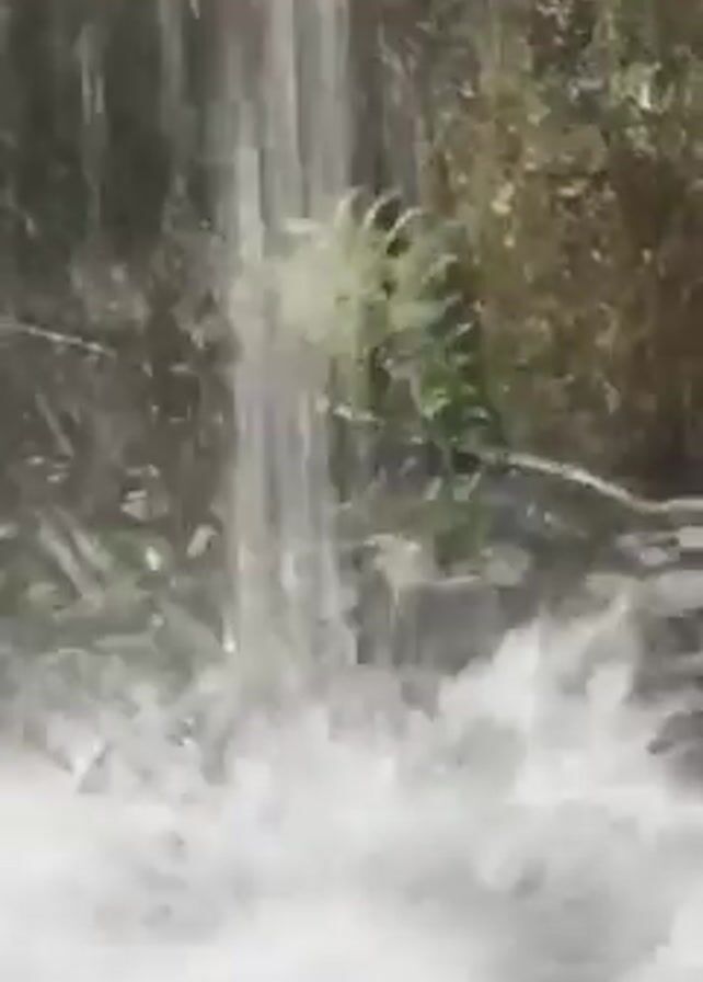 close-up view of a small waterfall cascading over rocks. Lush green vegetation grows on the rocky outcrop beside the falls. The water is clear, and the camera focuses on the point where the water hits the rocks below, creating a splash. The camera remains stationary throughout the video.