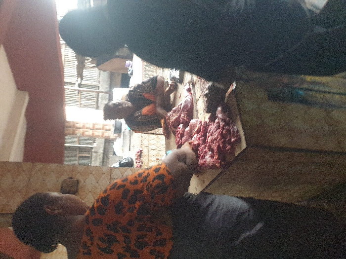 This image depicts a butcher stall within a market in Nkpor, Nigeria
