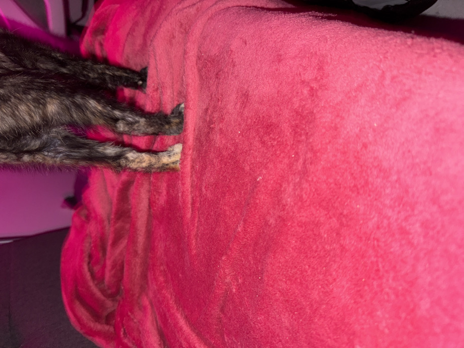 - "This image depicts an indoor scene where the lower posterior portion of a small, domesticated animal is visible, standing on a bright red, plush, textured blanket or fabric" by FM-rSR2K3, licensed under CC BY 4.0