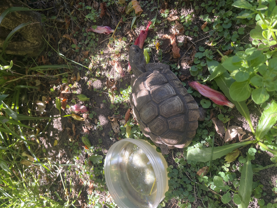 A tortoise stands on dirt and clover ground, near a plastic bowl of water. The tortoise has a brown patterned shell and an elongated neck. Scattered around it are shed pink flower petals and dead leaves. Lush green foliage grows on the right side of the frame, while tall grass appears on the left. Part of a textured stone object is visible in the background. Sunlight dapples the scene.