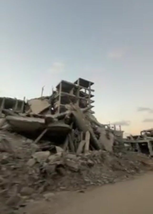 The video displays a scene of devastation. Buildings are reduced to rubble, with only skeletal remains of structures standing. The foreground is filled with piles of gray debris. In the background, some people are walking down a street. The sky is a pale blue, suggesting early morning or late afternoon. The overall atmosphere is one of destruction and loss.