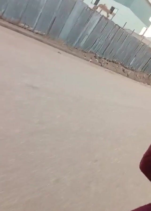 street scene taken from a moving vehicle. A group of people are walking on the side of the road, some are looking at the camera. There is a car parked on the side of the road. The street is paved. There is a building and a corrugated fence visible. The sun appears to be setting.