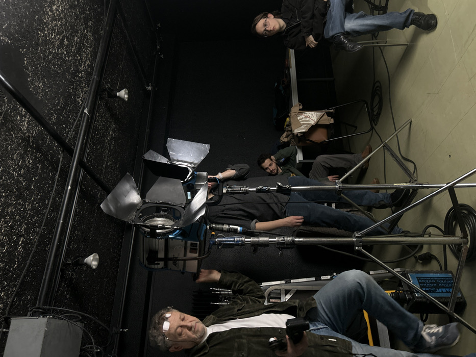 This image depicts an indoor studio setting in Paris, France, characterized by dark walls, a dark, textured ceiling with exposed pipes and small light fixtures, and a light-colored floor. Four individuals are present amidst film production equipment. Centrally positioned is a large, blue-colored professional film light, likely an ARRI, mounted on a silver stand with four open barn doors. A person in a dark shirt and blue jeans is partially obscured by the light, with their hands near its base, suggesting adjustment or setup. To the left, an older male with gray hair and glasses perched on his forehead, wearing a dark green jacket, white t-shirt, and blue jeans, holds a small black device in his left hand while looking downwards. His left foot is elevated, resting on an unseen object. A silver folding ladder is partially visible behind him. To the right, two individuals are seated. The first, a male with dark hair and a beard, wearing a green hooded sweatshirt and gray pants, sits at a light-colored table with various items scattered on it. He leans his head on his hand, looking towards the central light. The second, a young person with short brown hair and glasses, dressed in a dark jacket and blue jeans, sits on a chair with arms crossed, looking towards the right side of the frame, away from the central activity. Additional elements include multiple silver light stands, black coiled electrical cables on the floor, and a general impression of a workspace in preparation or during a break from filming.