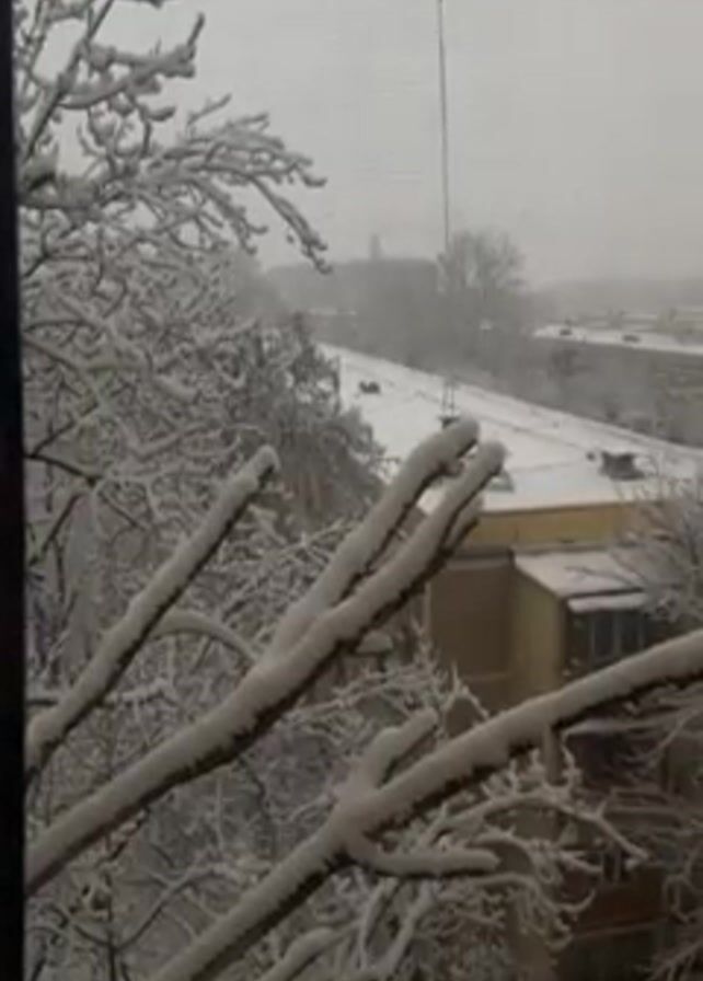snow-covered urban landscape viewed from indoors through a window. A bare tree branch covered in snow is in the foreground, partially obscuring the view. Beyond the branch, there is a low-rise building with a flat roof covered in snow. Further in the distance, there is a road or highway with sparse traffic and a few other buildings. The sky is overcast, and it appears to be snowing lightly. The overall scene is wintery and cold.