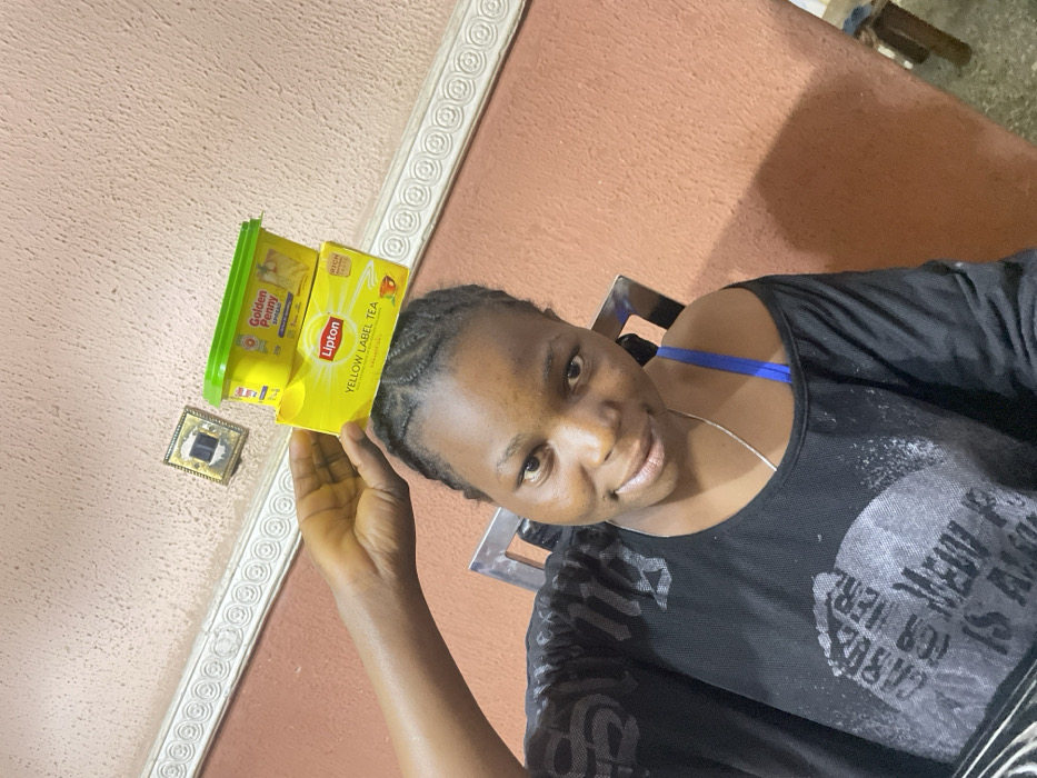 An indoor scene depicts an adult female of African descent seated, looking directly at the camera. She has braided hair and wears a dark-colored top, with a blue bra strap visible on her right shoulder, and a thin silver necklace. She is balancing a yellow Lipton Yellow Label Tea box on her head, with a yellow Golden Penny Spread plastic container (with a green lid) stacked directly on top of the tea box. Her right hand is raised, fingers slightly curled, positioned just above the stacked items on her head. The background consists of a textured, light brown/peach colored wall. A decorative, brass-colored electrical switch cover with a dark center is mounted on the wall to the upper-left. A horizontal decorative molding with a repeating pattern runs along the wall below the main textured section. A dark-colored chair frame is visible behind the woman, and a glimpse of a dark floor or lower wall section is at the bottom of the frame. The specific city of Jos, Nigeria, is not visually discernible within the image.