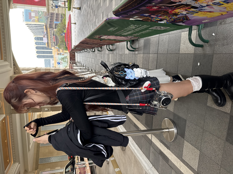A young female stands on a paved outdoor walkway in front of The Venetian Macao in Cotai, Macao. She is positioned in profile, facing right, with long reddish-brown hair styled in a ponytail. She wears a black long-sleeved top with thumbholes, a dark plaid mini-skirt, white lace-trimmed knee-high socks, and black platform boots. Her left hand holds a black jacket with white stripes. A black quilted mini-backpack with a light blue cat keychain is slung over her right shoulder, from which a retro-style instant camera in a clear case hangs by a colorful strap. The lower half of a second person, wearing a white dress and black sneakers, is partially visible behind her to the right. The background features the ornate, classical architecture of The Venetian Macao on the left, and a multi-story building with arched windows and a colorful facade further in the distance. A circular, tiered flowerbed with red and pink blossoms is centrally located in the mid-ground of the paved area, which is lined with metal stanchions on the left and green temporary barriers displaying "ALICE" themed cartoon graphics on the right. The sky is overcast.