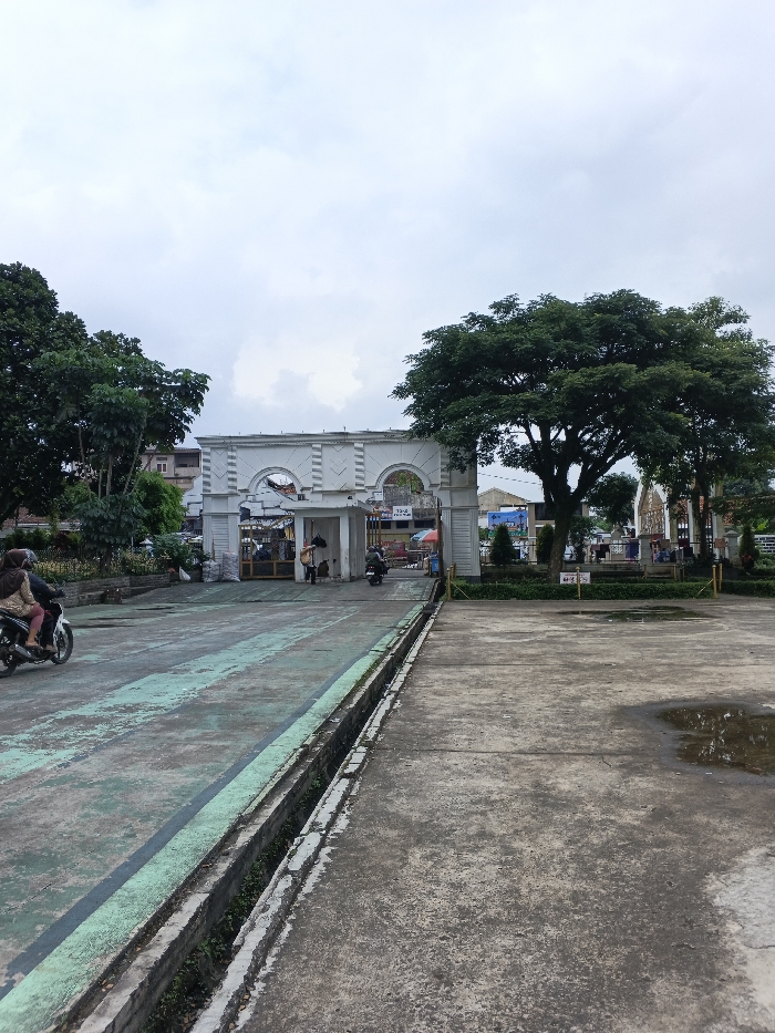 The scene depicts the Bình Khánh Ferry Terminal in Ho Chi Minh City, Vietnam, under an overcast sky. In the foreground, a worn concrete plaza with visible cracks and a large puddle occupies the right side. A segmented concrete drainage ditch runs horizontally across the mid-foreground, separating a lighter-colored concrete path from a wider, darker concrete surface with a prominent teal-green painted strip on the left. In the midground, a white scooter with two occupants travels right-to-left on the green-striped path, approaching a large, white, classical-style arched gateway. The driver wears a brown head covering and a light-colored garment, while the passenger behind wears dark clothing. The gateway features a prominent central arch flanked by two narrower arches, all adorned with recessed decorative arch patterns. Through the gate openings, multiple individuals, including one on a dark scooter and another person on foot, are visible, along with market stalls featuring colorful umbrellas and various goods. To the right of the main gate, a large, mature tree with dense green foliage stands prominently. Further right and slightly behind, an ornate, multi-tiered traditional-style structure, possibly a shrine or temple, is visible amidst smaller trees and shrubs. To the far left, dense green trees partially obscure buildings in the background. The upper half of the image is dominated by a uniform, light grey, cloudy sky.