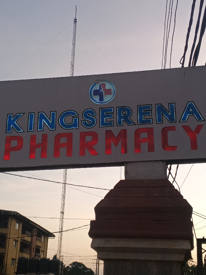 - "This image depicts an urban street scene in Onitsha, Nigeria, featuring a commercial sign for "KINGSERENA PHARMACY" by FM-mFVo23, licensed under CC BY 4.0