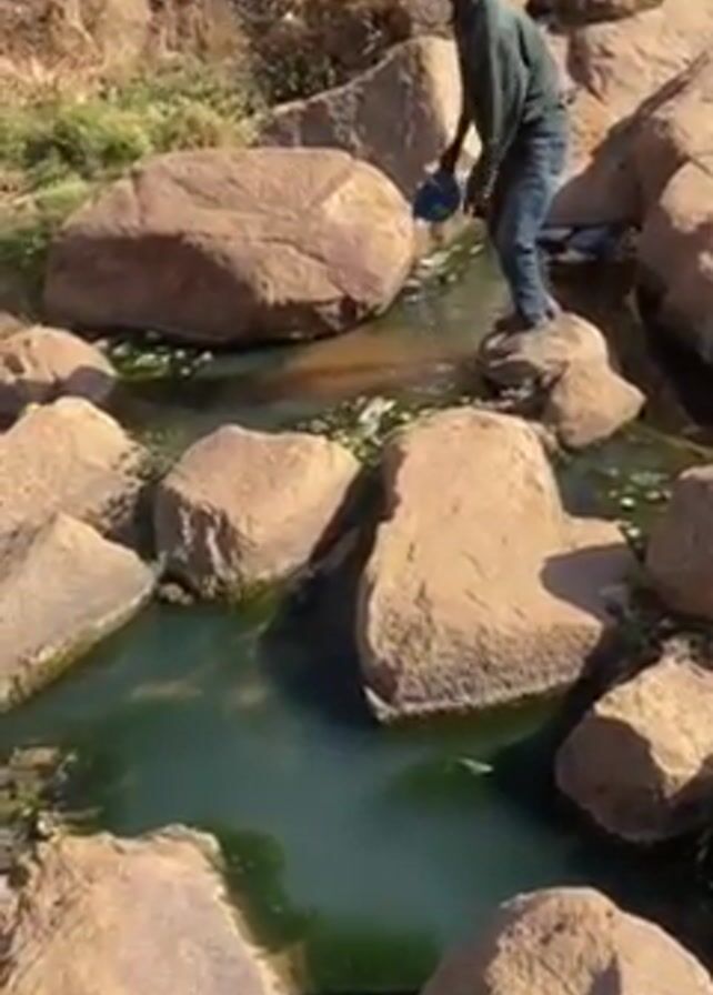 n individual standing on rocks next to a body of water. The water has a greenish tint and appears to be stagnant. There are rocks of various sizes throughout the water. The individual is holding an object, possibly a container, and appears to be looking into the water. Debris and trash are scattered around the rocks and in the water. The surrounding environment appears to be rocky and somewhat barren.