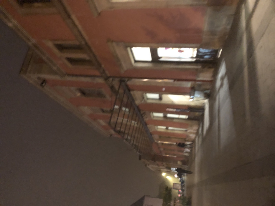 The image depicts a nighttime street view of the Saverne railway station in Saverne, France. The primary subject is a long, two-story building with a reddish-orange facade featuring lighter-colored architectural elements such as pilasters, cornices, and window frames. A dark-colored, multi-paneled awning extends from the upper facade over the adjacent paved area. Multiple rectangular windows along the building's length are illuminated with a warm, yellowish light from inside, as is an open doorway on the lower right side. The ground in the foreground and midground consists of a wide, dark-paved walkway or street, exhibiting elongated shadows. Several human figures are discernible in the midground; at least one figure is walking away from the camera on the left side of the walkway, and another is closer to the building on the right. Further down the street on the left, additional buildings and sources of yellow light from streetlights are present. A cylindrical waste receptacle is visible near the building on the right. The sky overhead is dark and appears overcast. The overall scene is dimly lit.