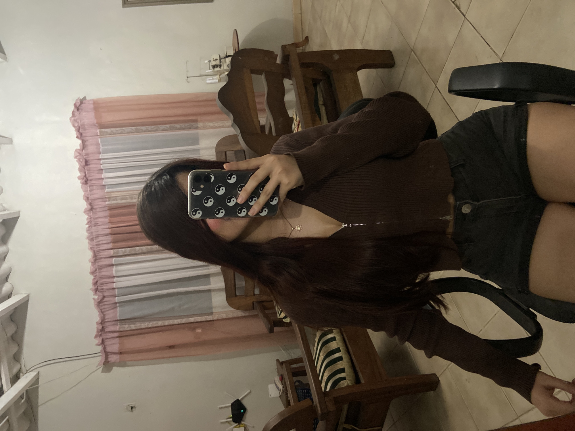 A person sits in a chair, wearing a brown long-sleeved shirt and black shorts. The person is holding a cell phone with a black case decorated with white yin-yang symbols, obscuring their face. The background includes curtains, wooden furniture, and tiled flooring. There is no information to indicate that this image was taken in the city of Juan Griego, Venezuela.