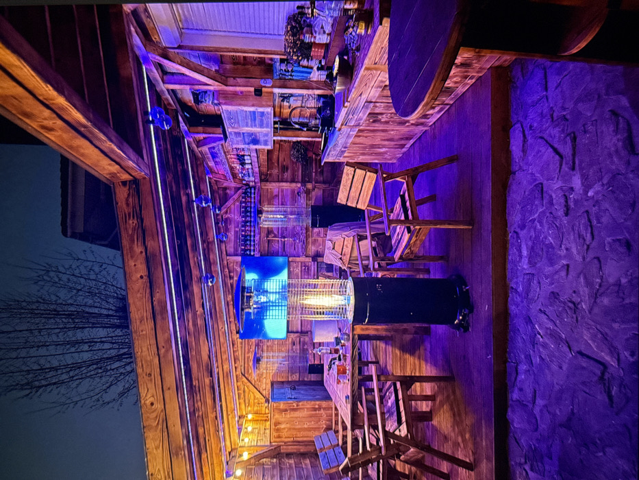 A rustic outdoor bar area is lit with purple hues