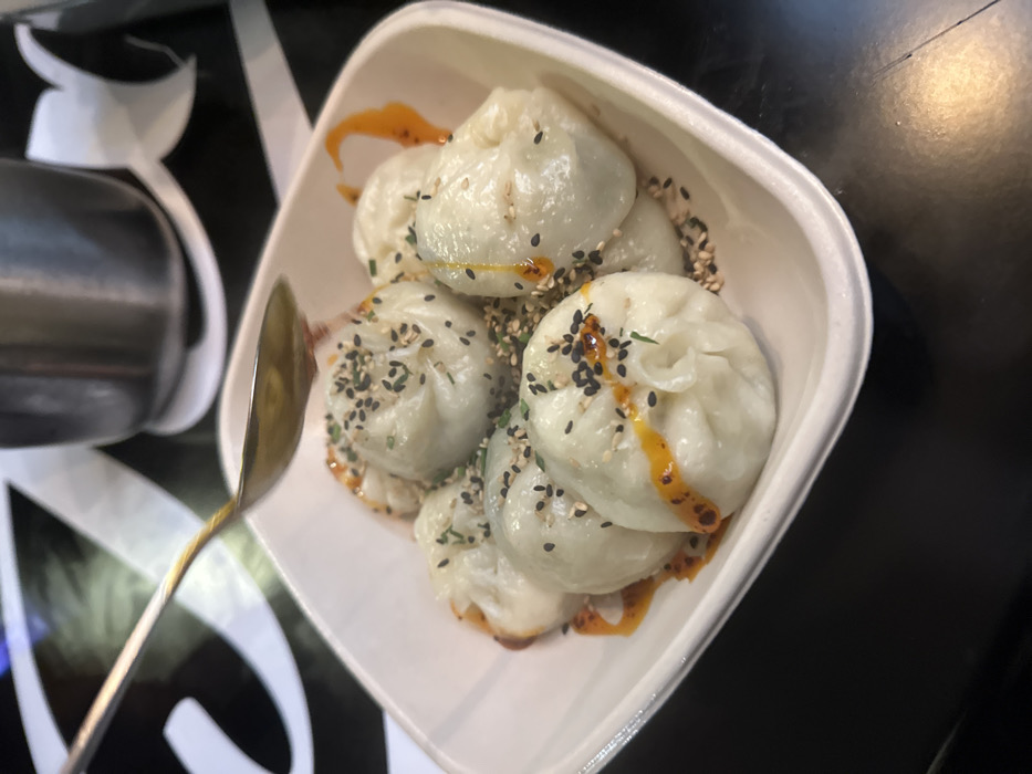 - "A white bowl holds several steamed dumplings adorned with sesame seeds, chopped herbs, and a drizzle of chili oil" by FM-n6yWE2, licensed under CC BY 4.0