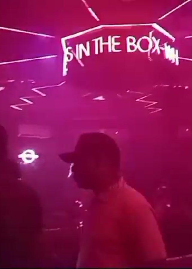 inside of a lively nightclub, bathed in purple and pink neon lights. A neon sign that reads "Spin the Box" is prominent. People are visible, some standing, others moving around, all enjoying the music and atmosphere. One person is spinning a large vinyl record. The video also captures other neon signs and lighting, contributing to the energetic ambiance of the club.