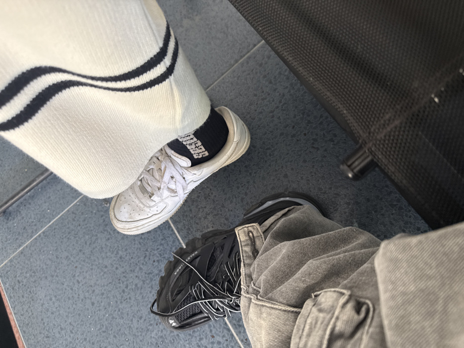 The image presents a downward-angled close-up of the lower extremities of two individuals and a piece of luggage on a tiled floor. The environment lacks specific features to confirm the stated location of Nesebar, Bulgaria. On the left, one subject wears light grey denim cargo pants and a black Balenciaga Track sneaker, size 44, with the brand name "BALENCIAGA" visible on the side. The laces are black and white. On the right, a second subject wears off-white knit pants featuring two wavy dark stripes vertically along the outer leg. This individual wears a white Nike Air Force 1 sneaker, which exhibits minor scuffing, and a black ankle sock with white text, possibly "SESSO" or "SESES." Both individuals' feet are positioned on a dark blue or gray tiled floor, which features visible grout lines. In the lower right quadrant, a portion of a black, textured piece of luggage, including a dark handle component, is visible. A thin, dark metal bar is partially visible in the upper background.