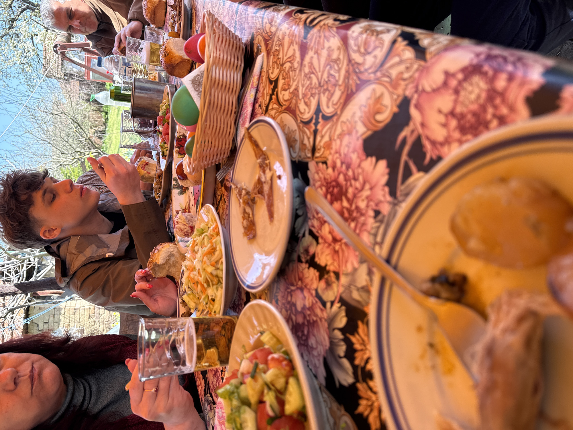 n outdoor dining scene in Banitsa, Bulgaria. A table is laden with food, including bread, salad, and various dishes. Several people are seated around the table, eating and drinking. One person is holding a piece of bread, while another holds a glass. The tablecloth has a floral pattern. In the background, trees and buildings can be seen. The setting suggests a casual meal taking place outdoors.