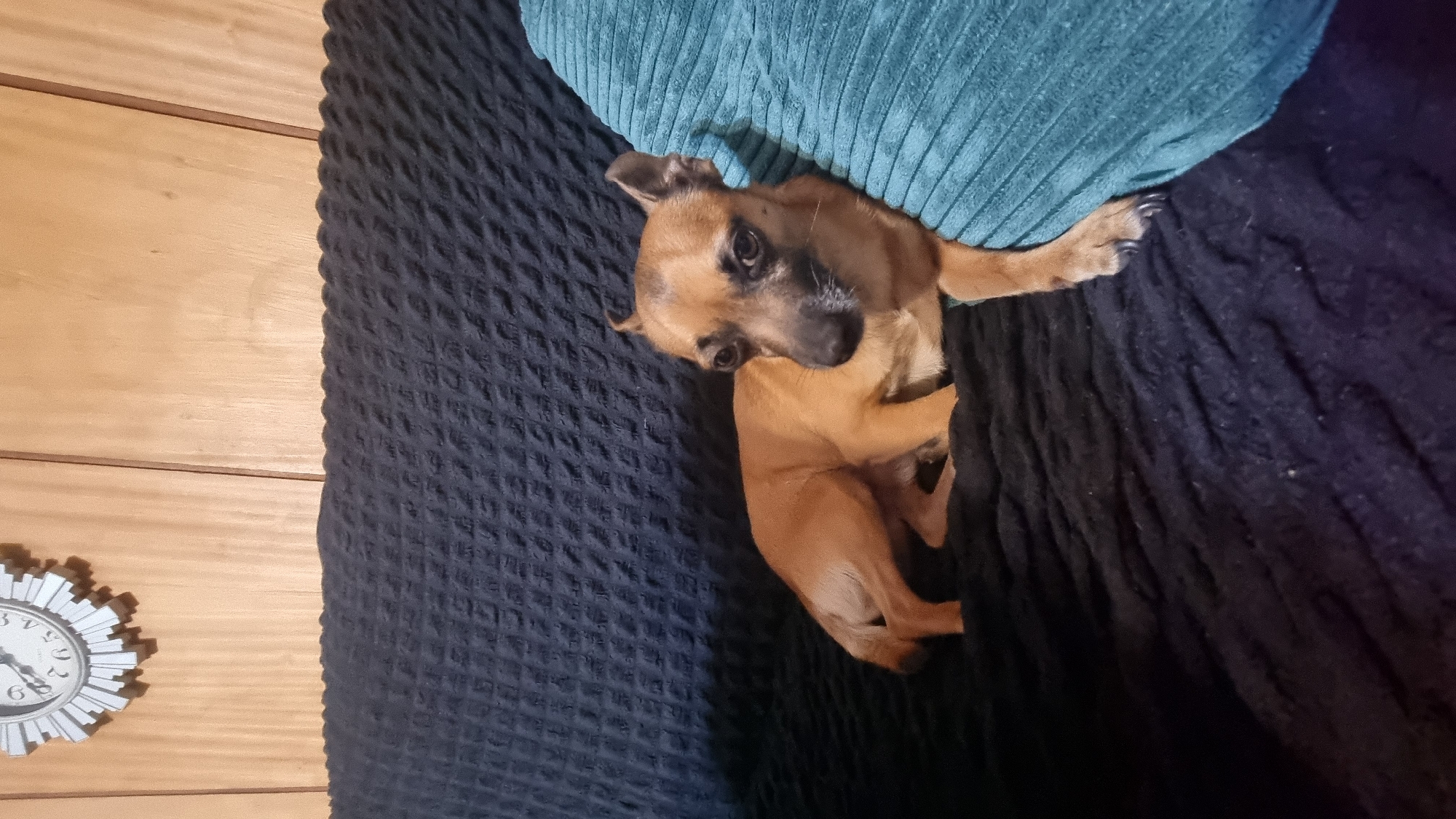 An indoor scene, situated in Dolni Chiflik, Bulgaria, features a small, tan-colored dog with dark brown facial markings resting on a dark blue, textured sofa. The dog lies with its body curled slightly, its front paws extended onto a teal-colored, ribbed throw pillow to its right. The sofa's backrest, covered in the matching dark blue textured fabric, is visible behind the dog. In the upper left quadrant of the background, a silver-toned wall clock with a spoked bezel is partially visible on a light brown wood-paneled wall.