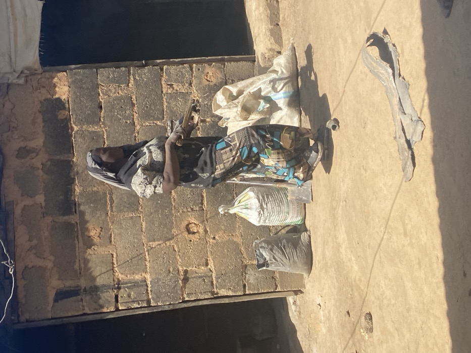 An outdoor scene in Udu, Nigeria, depicts a dark-skinned adult female standing on a dirt ground in front of a reddish-brown concrete block wall. The woman is positioned slightly right of center, looking towards her right. She wears a light grey headscarf, a patterned blouse with puffy sleeves over a dark top, and patterned trousers featuring blue, green, brown, and black geometric designs. Dark open-toed sandals are on her feet. Her right hand holds a bundle of dark, thin, stick-like objects. To her left, against the wall, are two upright, filled sacks: a dark fabric sack in the foreground and a larger, white woven sack with faint green and yellow markings behind it. A dark, flat, shovel-like tool leans against the wall between the white sack and the woman's leg. Near her feet, a dark grey cylindrical object lies on the ground. In the lower right foreground, a flattened, elongated piece of dark, possibly rubbery material is visible on the dirt. The background wall features two dark, rectangular openings, consistent with doorways. Strong sunlight casts sharp shadows across the ground and objects. A thin, dark line, possibly a wire or string, is visible in the upper left background.