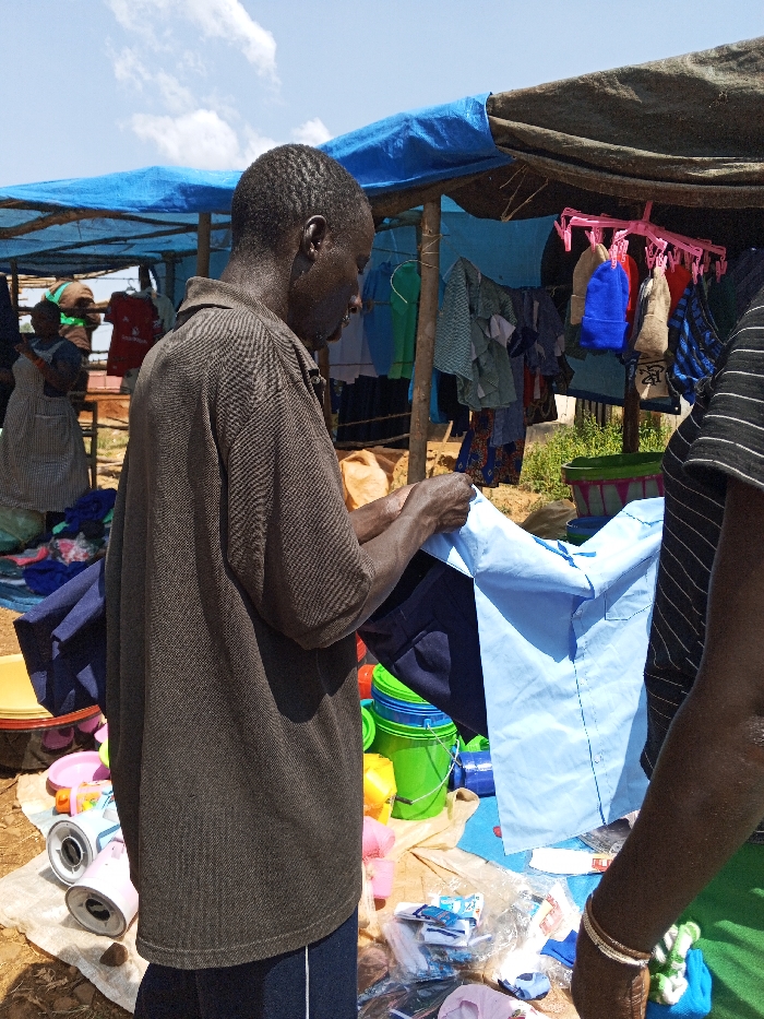 This image captures an outdoor market scene in Borabu Chitago ward, Kenya, under a partially cloudy sky