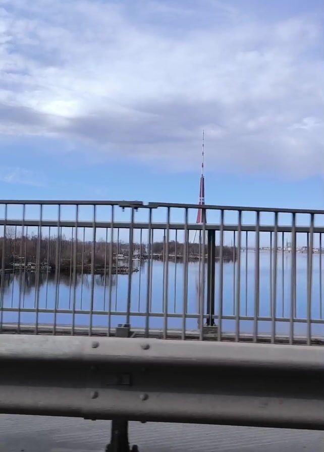 view from a moving vehicle, likely on a bridge. The camera is positioned low, showing a metal guardrail and a fence-like barrier. Beyond the barrier, there's a body of water reflecting the partly cloudy sky. In the distance, a tall, red and white striped tower is visible. There's a patch of land with trees in the middle of the water, and some buildings can be seen on the far shoreline.