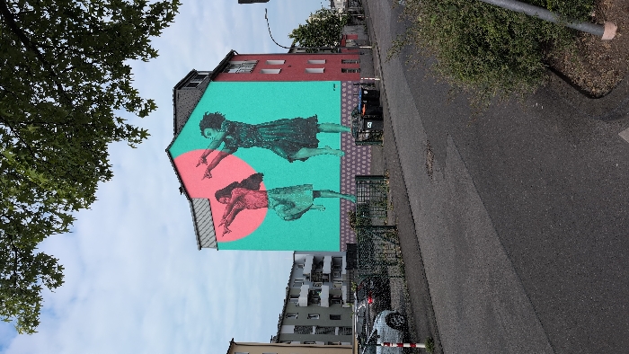 mural depicting two women, one in a red and one in a blue dress, painted on the side of a building at the corner of two streets in Wuppertal, Germany, near the intersection of latitude 51