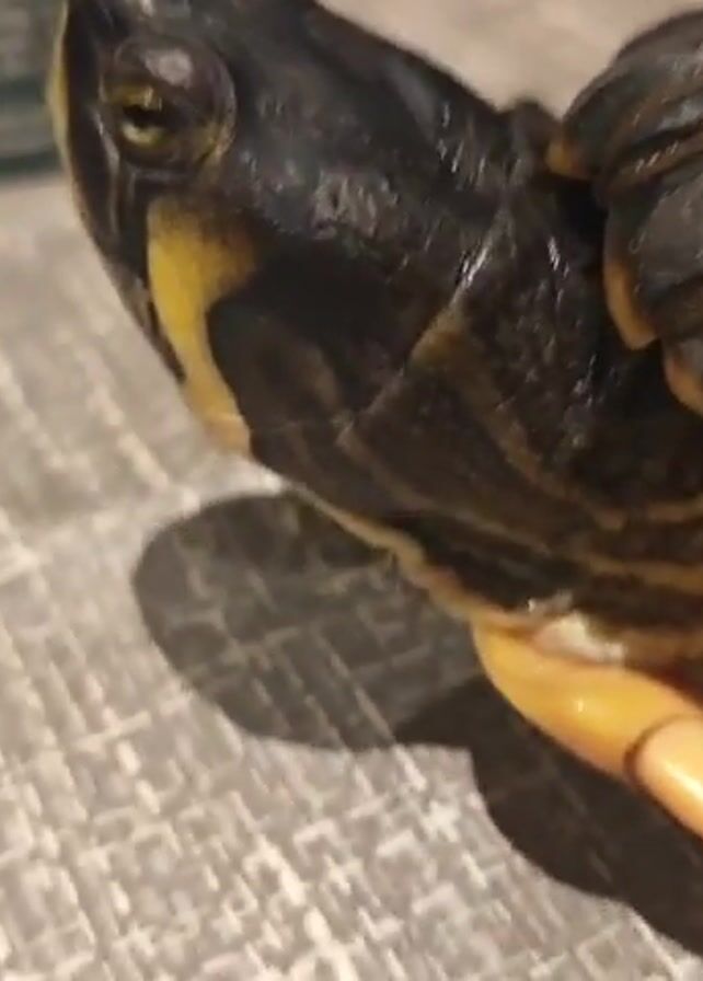 The camera focuses on a small turtle with a black head and yellow stripes