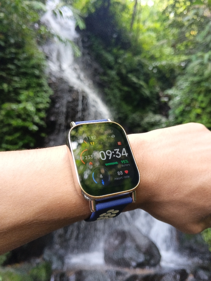 A smartwatch on a wrist displays the time as 09:34 with 95% battery life and a heart rate of 88. Lush greenery and a blurry waterfall form the backdrop. The watch has a gold-tone case, a blue band adorned with a pattern of small, light-colored shapes. The display also shows steps, calories burned, and the date, 11/21. The arm is fair-skinned and positioned to showcase the watch against the natural setting.