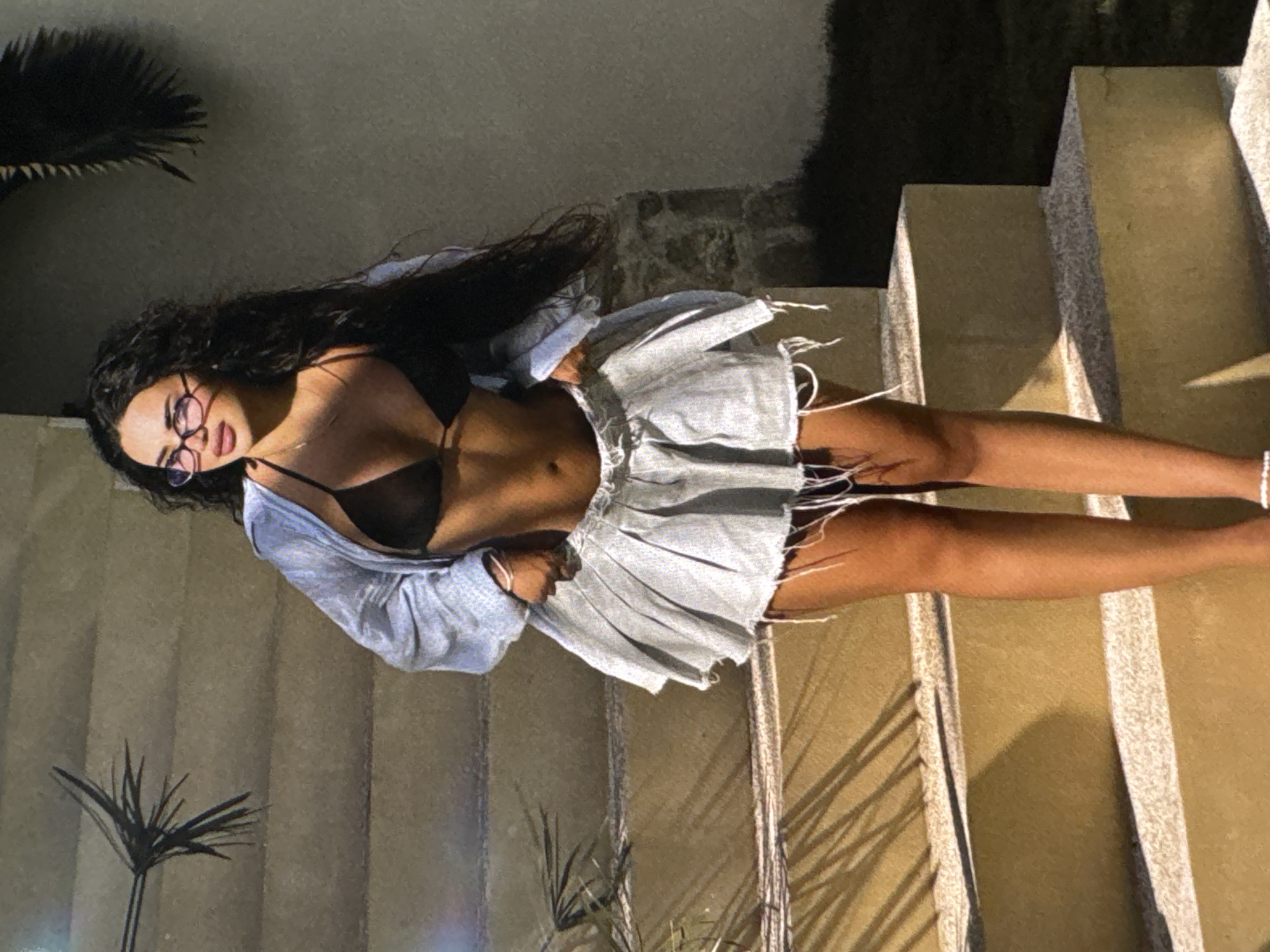 The image depicts a single female subject standing outdoors, facing forward with her body slightly angled to the viewer's left. She has long, dark, wavy hair and wears light-tinted round eyeglasses. Her attire consists of a black bikini top, an unbuttoned light-colored long-sleeved shirt worn open over the bikini, and a light-colored pleated mini-skirt with a frayed hemline. Both hands are positioned at the waistband of her skirt, holding it. Her gaze is directed off-camera to the left. The background consists of light-toned concrete or stone steps, with dark foliage visible on the upper left and right, casting distinct shadows. Strong direct sunlight is present, creating sharp shadows and a lens flare effect on the left side of the image. The environment suggests an outdoor terraced or garden area. The exact location within Yerevan, Armenia, is not identifiable from the image content.