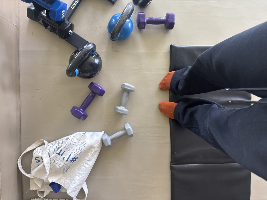 An overhead forensic view captures a gym or workout area scene in Mexico City, Mexico. A person's lower legs, wearing dark blue trousers and bright orange socks, are positioned over a black padded surface, likely an exercise bench or mat, at the bottom of the frame. On the light-colored floor, various fitness equipment is scattered: two grey dumbbells, two purple dumbbells of differing sizes, a black kettlebell with blue markings, and a blue kettlebell with black markings. A black metal weight rack, partially visible, holds blue dumbbells labeled "5LB" and "8LB," with the brand "TAYGA" also discernible. A white canvas tote bag, displaying blue text and a "#i'm" graphic, lies on the floor near the grey and purple dumbbells.