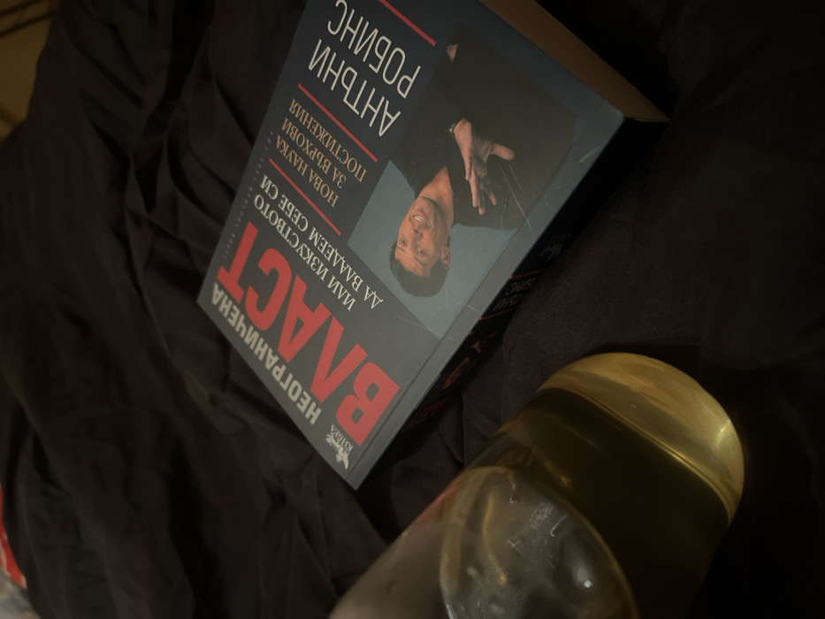 In Pernik, Bulgaria, a still life image features a book and a glass resting on a dark, crumpled fabric surface, consistent with bedding. The book, oriented diagonally from the lower right towards the upper left, displays a blue cover with the title "НЕОГРАНИЧЕНА ВЛАСТ" (Unlimited Power) in red, attributed to "АНТЪНИ РОБИНС" (Anthony Robbins) in white. A photograph of a smiling Anthony Robbins, gesturing with his right hand, is visible on the cover. To the bottom left, a transparent glass contains a yellowish, translucent liquid, appearing to have ice cubes or condensation, and is partially out of focus. The scene is illuminated by dim, ambient light, casting subtle shadows across the fabric.