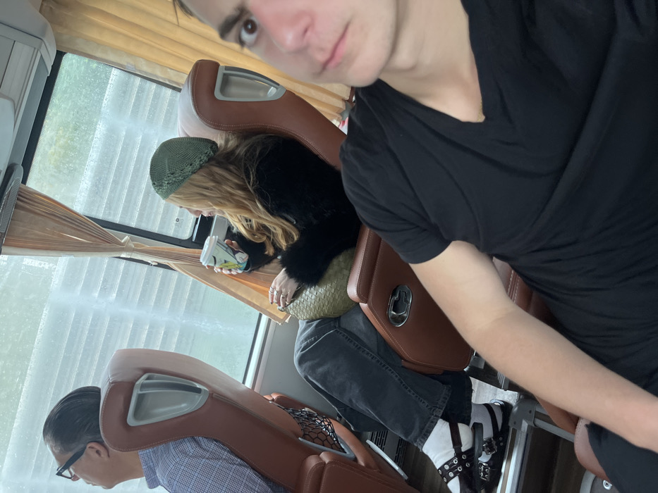 The image depicts the interior of a passenger transport vehicle, likely a bus or train, operating in Chengdu, China. Three individuals are present. In the immediate foreground on the right, a male with light skin and wearing a black V-neck t-shirt is partially visible, directly facing the camera as if taking a photograph. To his left and slightly behind, a female with long reddish-blonde hair is seated, wearing a green knit beret, a black fluffy long-sleeved top, dark jeans, white socks, and dark Mary Jane-style shoes adorned with multiple buckles and studs. She holds a colorful paper coffee cup in her right hand, her left hand resting on a light green woven bag, as she looks out the window to her left. In the row in front of the female, a male wearing glasses and a blue and white checkered shirt is observed from behind, looking upwards and out the window. The vehicle features brown leather-like seats with grey plastic accents and beige curtains partially covering the window. Outside the window, the view is blurred with vertical streaks, indicative of motion and possibly rain on the glass, revealing an elevated urban structure with discernible horizontal layers under an overcast sky.